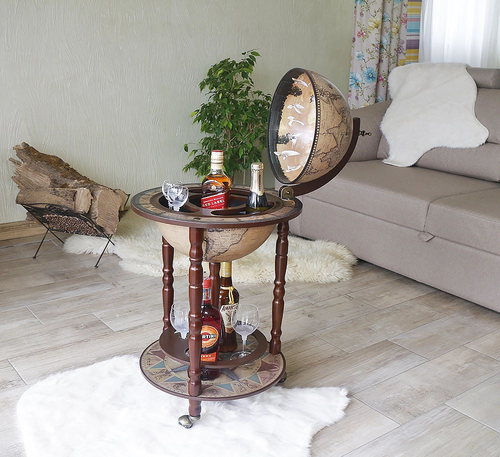 Глобус бар підлоговий Зодіак 33001N підійде як для спиртного, так і для безалкогольних напоїв. Діаметр сфери становить 330 мм. Сфера з красивими зодіакальними картами, всередині сфери можна складати пляшки і фужери, також є підставка внизу бару. Ніжки бару виконані з дерева, сфера – ударостійкий пластик, полки виготовлені з МДФ.Підлоговий бар малого розміру поміститися навіть в самій маленькій квартирі або офісі. Бар глобус Зодіак 33001N – шикарний презент шанованій людині. Також цей сувенір стане підходящим подарунком колективу начальнику або директору.